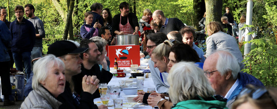 De Vrijheidsmaaltijd wordt dit jaar bereid door kookgroep De Smaken van de Wereld uit Amsterdam Noord. Wederom vegetarisch: soep, brood, salade en dipjes. Wij zorgen ook voor borden en bestek. Schuif gezellig aan!